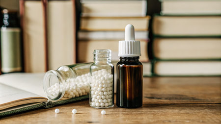 A bottle of homeopathic pills on a table, with vintage books in the background