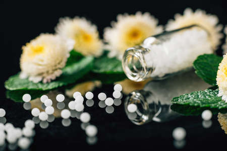 Homeopathy - Homeopathic globules scattered out of glass bottle, black background decorated with flowers.