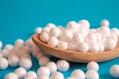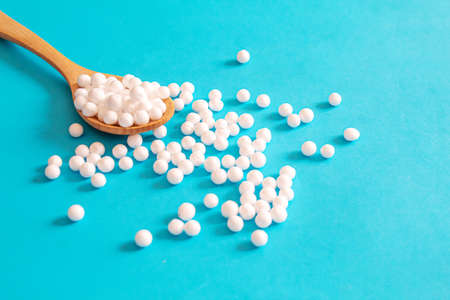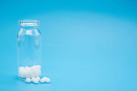 Alternative homeopathy medicine concept. Homeopathic globules scattered from a clear glass bottle on light blue background, copyspace for text. Health care and pills concept