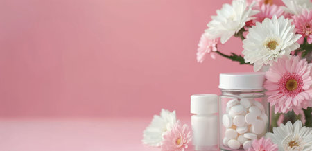 A glass jar filled with white and pink tablets sits alongside a smaller container, both surrounded by delicate flowers, creating a serene and aesthetic display against a soft pink backdrop.