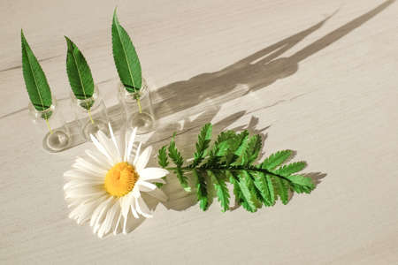 Bottles with green leaves and chamomile with sunlight effect on wooden background