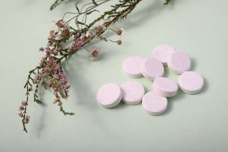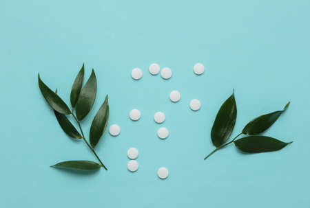 Herbal pills. White pills with green leaves on a blue pastel background. Minimalistic medicine still life