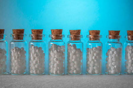 Homeopathic granules .Homeopathic granules in small glass flasks, some granules scattered on the table with reflection