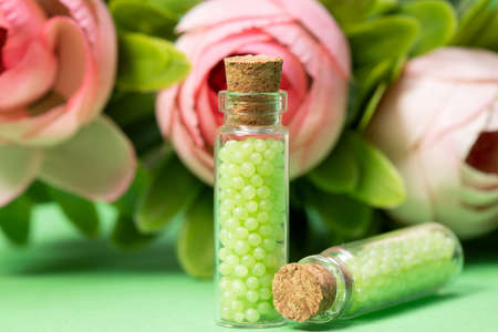 Homeopathic Pills Macro closeup image of homeopathic medicinal pills made from an inert substance sugarlactose in clear bottles on a green background.