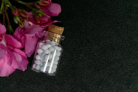 Close up image of homeopathic medicine bottle consisting white sugar balls and pink flower on dark background - Natural Homeopathy Concept