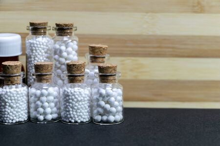 Homeopathy medicine bottles of pills on wooden and dark background. Medicine concept