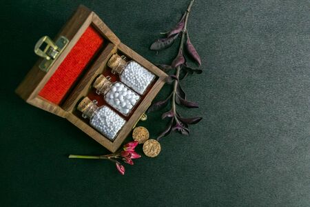 Top view of homeopathy medicine bottles in wooden old box with wild flower and herb on dark background.