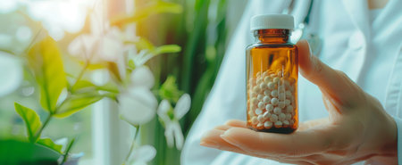 Bottle of homeopathic pellets held by professional homeopath, set against modern background of clinic. Concept of homeopathy, alternative medicine, organic apothecary, naturopathy. Banner. Copy space