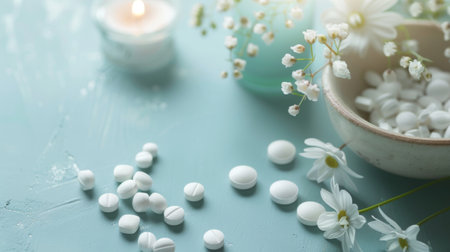 A glass jar filled with white and pink tablets sits alongside a smaller container, both surrounded by delicate flowers, creating a serene and aesthetic display against a soft pink backdrop.