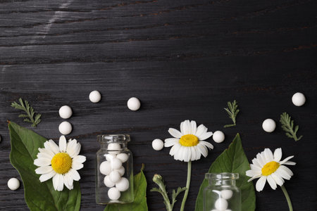 Homeopathy. Flat lay composition with many pills and chamomile flowers on black wooden table, space for text