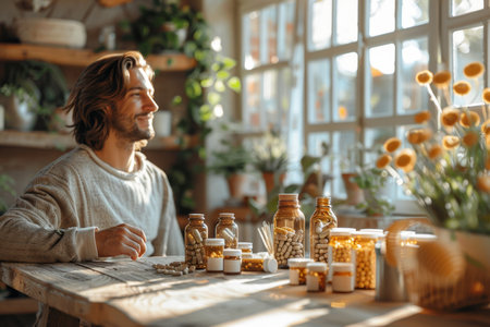 A man is sitting at a table in a home interior. Next to the man there are different vitamins in jars on the table.