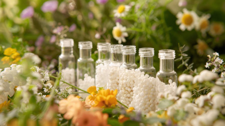 Variety of homeopathic remedies in small glass vials, neatly arranged against a background of fresh herbs and flowers. Concept of homeopathy, alternative medicine, holistic health, natural ingredients