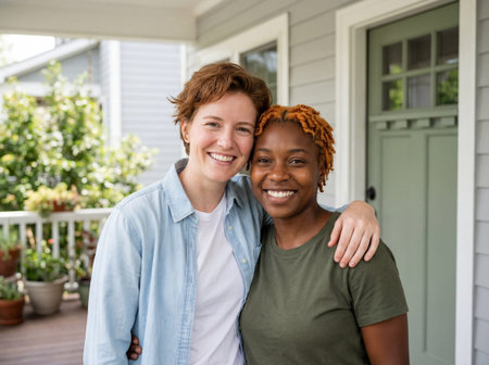 Cheerful multiracial lesbian partners hug affectionately on the porch of their residence smiling brightly at the camera on a beautiful sunny afternoon.