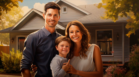 a Family in front of newly purchased house, smiling proudly. Real estate and a life goal accomplishment. Home ownership.
