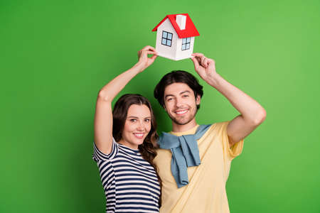 Photo of young couple happy positive smile hold home real estate mortgage moving isolated over green color background
