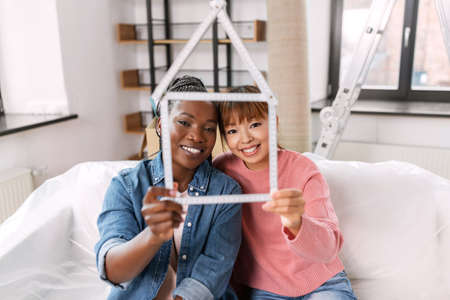 happy smiling women with ruler in shape of house
