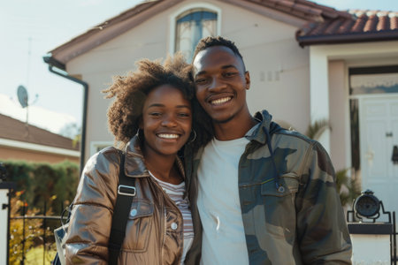 A joyful couple stands together in front of their home, radiating love and connection in a vibrant outdoor setting, perfect for themes of happiness and lifestyle.