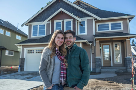 Smiling couple standing in front of their new home, symbolizing happiness and achievement in homeownership. High quality photo