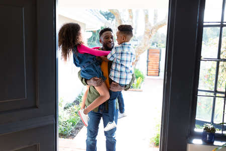 Happy african american children welcoming their father coming back home. family time, having fun together at home.
