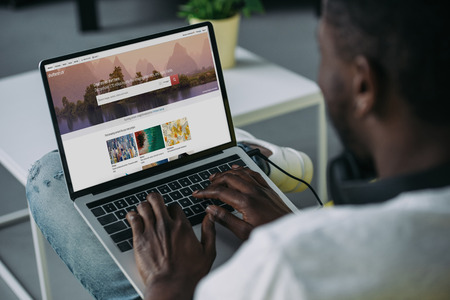 Sankt-Petersburg Russia, January 11, 2018: Apple iMac with Airbnb homepage on monitor screen under magnifying glass . Airbnb is online marketplace offering service to rent short-term lodging. Homepage of Airbnb.com
