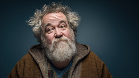 A cheerful fat man with a shaggy beard showcases his warm smile, creating a friendly and inviting atmosphere in front of a dark blue backdrop.