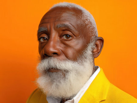 Distinguished elderly man with a white beard and hair, wearing a vibrant yellow jacket and white shirt, poses against an orange background, displaying warm expression and wisdom