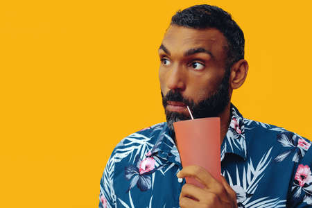 happy african american man wearing Hawaiian shirt with sipping cocktail glass with straw