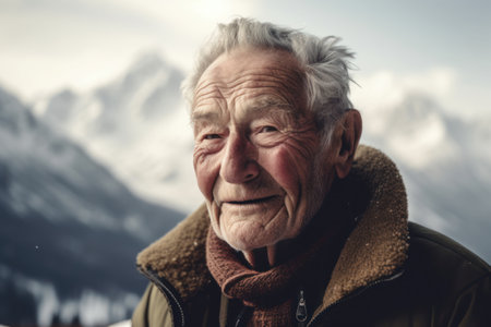 Portrait of an elderly man on the background of snowy mountains.