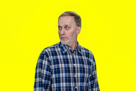 Portrait of serious caucasian man is looking back. Isolated on yellow.