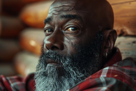 Bald man with a salt-and-pepper beard gazes thoughtfully. He wears a green jacket, with subtle freckles visible on his skin. Moody lighting accentuates his contemplative expression