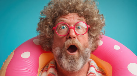 A man with curly hair and a gray beard looks shocked while wearing bright pink glasses and a donut-shaped pool float. He appears joyful during a summer day.