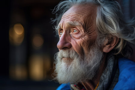 portrait of an elderly man with gray hair mustache and beard black and white street photography style homelessness insecurity and mental health concept