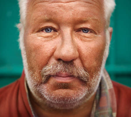 Portrait of a bearded man with blue eyes on a gray background