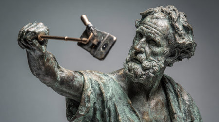 This captivating sculpture depicts an ancient philosopher joyfully taking a selfie with a smartphone, blending history and modernity in striking contrast.