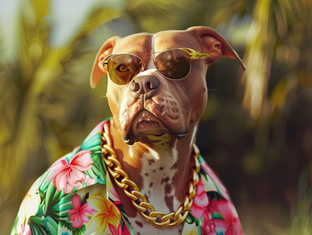Photorealistic, miami vice style, American Pit Bull Terrier, sunglasses, floral shirt, gold chain Full body of African American male owner