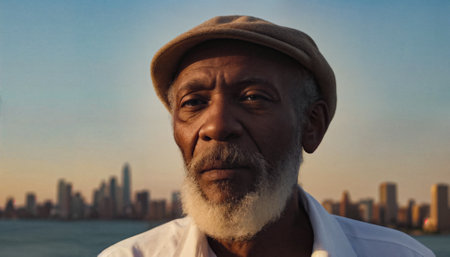 Portrait of a poor or homeless but well-groomed black old man or grandfather with a gray beard and hair wearing a hat or cap and shirt in the light of the setting sun on the streets of a big city