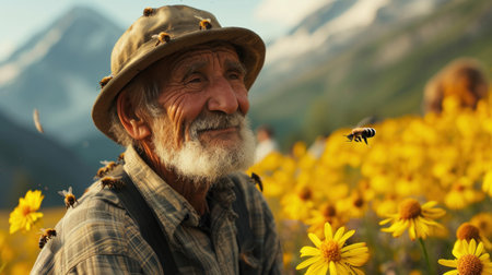 Close-up of an old man beekeeper keeping bees with mountains in the background and beautiful flowers