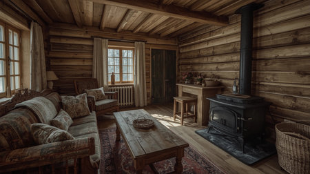 Cozy rustic log cabin living room interior with fireplace