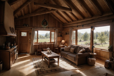 Interior of a wooden house in the mountains. Wooden furniture.