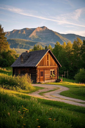 A beautiful log cabin nestled in a scenic landscape, surrounded by vibrant greenery, showcasing rustic charm in the tranquil evening light. Perfect for retreats and outdoor escapes.