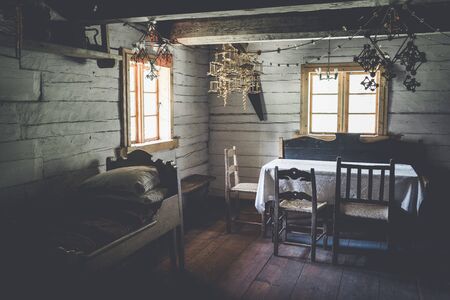 The interior of an old living room showing how people lived 200 years ago. Ethnographic Open-Air Museum, Latvia, Riga, 13.05.2018