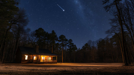 A wooden cabin lights up under a starry sky as a meteor flies by in the night. The tranquil forest setting adds to the peaceful atmosphere of this nighttime moment.