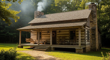 A rustic log cabin sits quietly in a misty pine forest, with smoke drifting from its stone chimney. A wooden swing sits on the porch, and tall trees surround the home in a moody, atmospheric, and slightly mysterious setting.