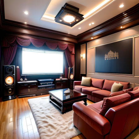 Elegant home theater room inside a modern apartment with comfortable seating, a large screen, and state-of-the-art sound system, designed for the ultimate entertainment experience