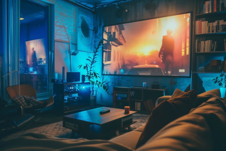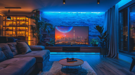 An inviting living room at night with warm lighting and a large flat screen TV displaying. Comfort and technology blend seamlessly.