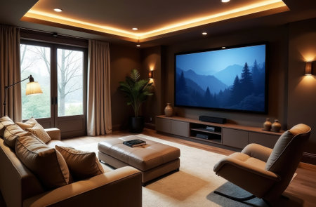Cozy movie night experience home theater interior design relaxing environment indoor viewpoint comfort concept
