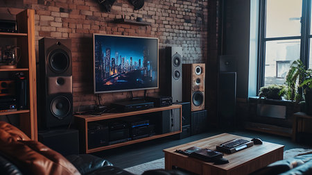 A stylish living room featuring an impressive home theater system in a cozy urban setting.
