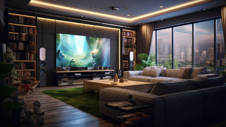 smart home with voice-activated lights, thermostat, and entertainment system, created with generative ai