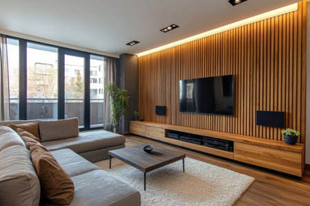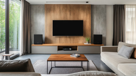 A contemporary living room features a large flat-screen television mounted on a wooden accent wall. Comfortable sofas are arranged around a low coffee table, enhancing the inviting atmosphere