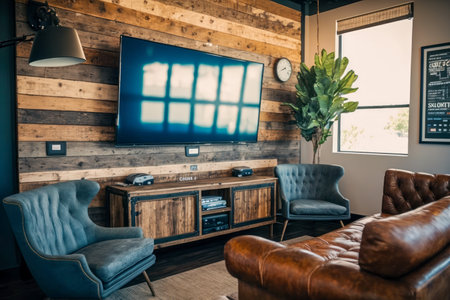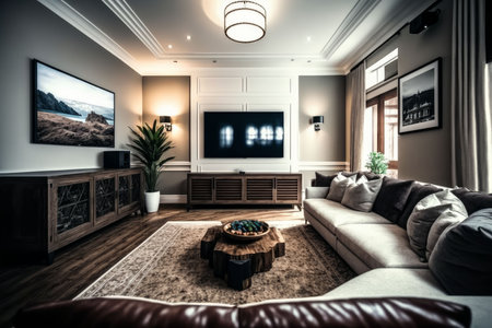 Modern Living room with Big TV on the wall in the room. Illustration Generative AI